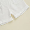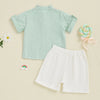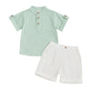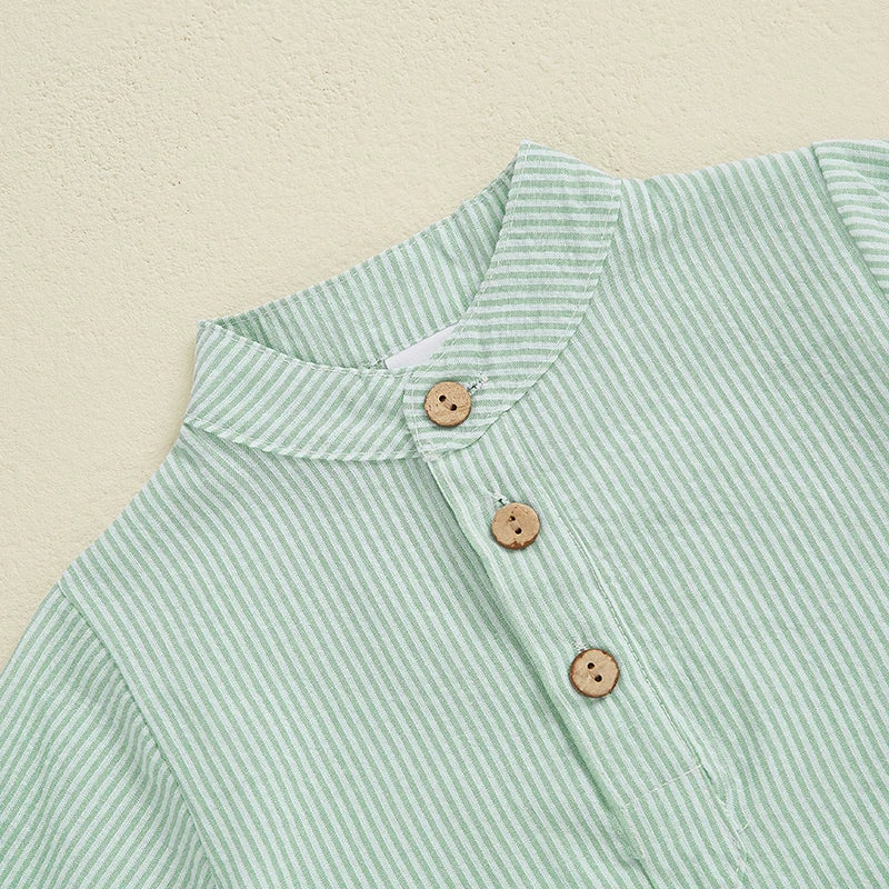 The "Alfie" handsome cotton, shorts set includes white, cotton shorts featuring half, elasticated waistband. The fresh, pinstriped, mandarin collared shirt with faux, rolled up sleeve design completes the set. Shades of mint green or powder blue, co ordinate beautifully with the pure white shorts for a gorgeous summer look.