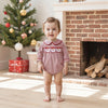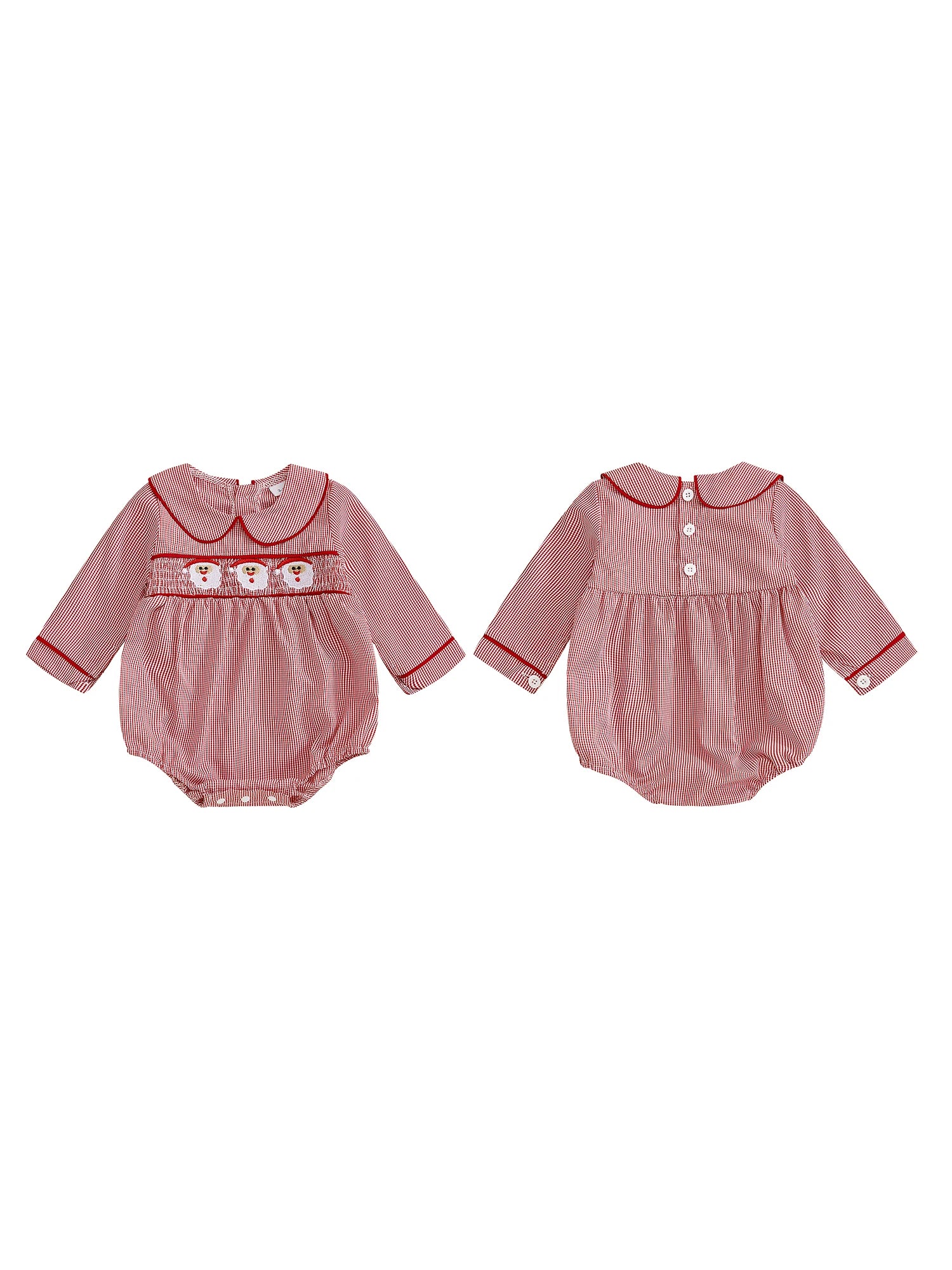 Dress your little one in festive charm with the "3 Little Santas" romper. This long sleeved, red gingham outfit features delicate red piping and a smocked bodice embroidered with three cheerful Santa faces, adding a joyful touch.