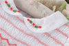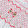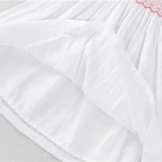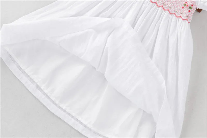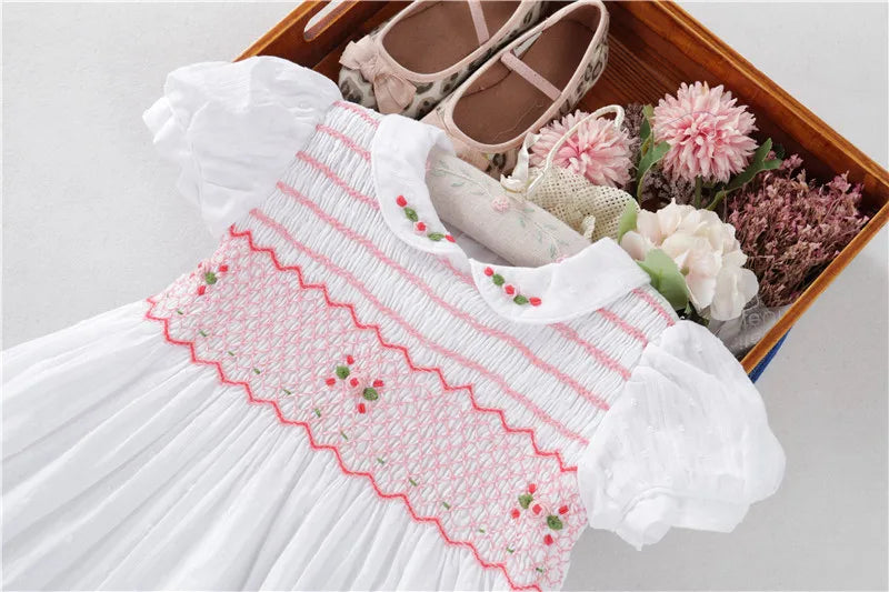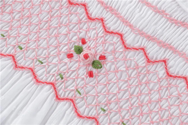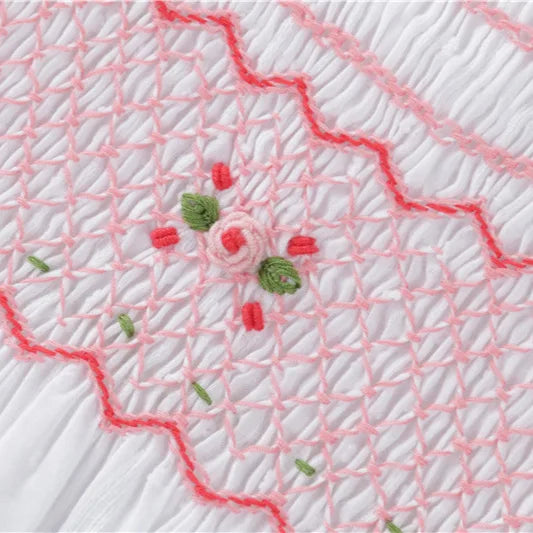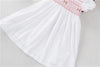 The "English Rose" Dress captures timeless elegance with its vintage inspired white Swiss dot fabric and delicate pink, rose bullion embroidery on the smocked bodice. Featuring an embroidered Peter Pan collar, short puff sleeves and a graceful tie back bow.