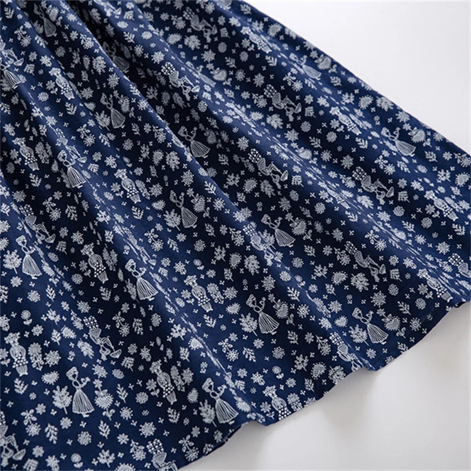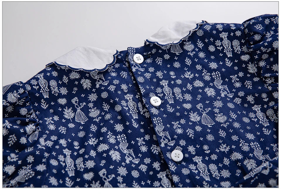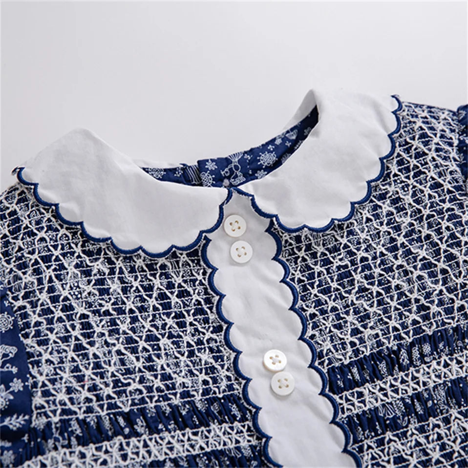 The "Nellie" Dress is a standout choice for your little girl's special occasions. Made from traditional navy blue cotton, it showcases pure white scalloped-edge trims embroidered in navy for an elegant contrast. The short puff sleeves and scalloped Peter Pan collar add timeless charm, while the large bow at the back delivers a sweet, classic finish. Featuring a unique Scandinavian folk art print, this dress offers a distinctive style that ensures she will look truly unforgettable.