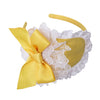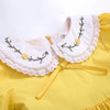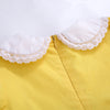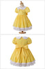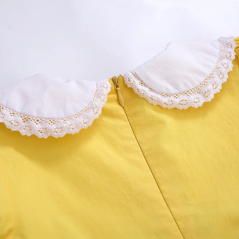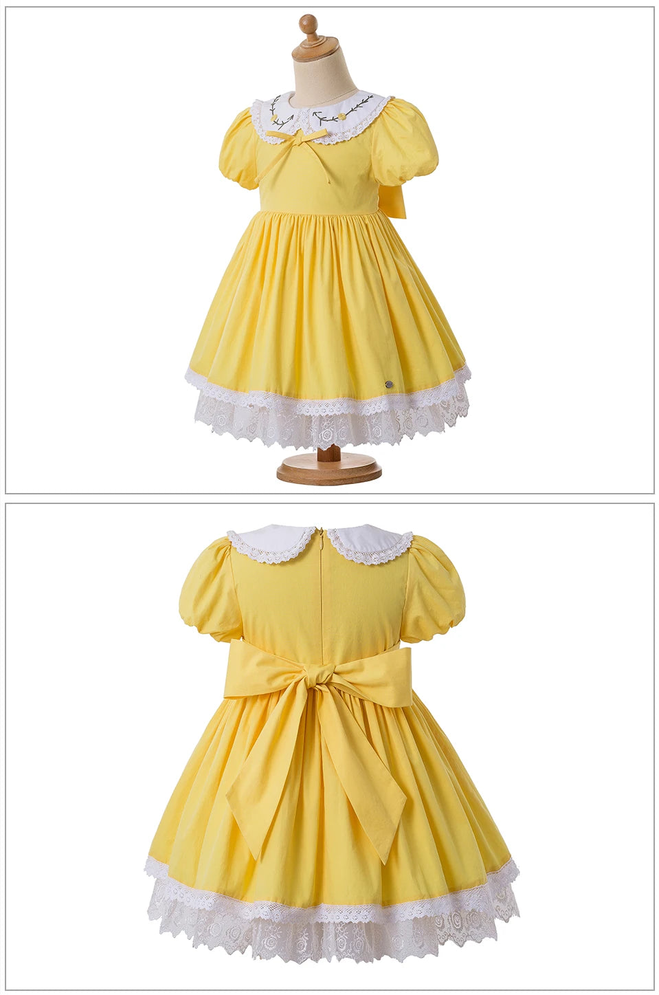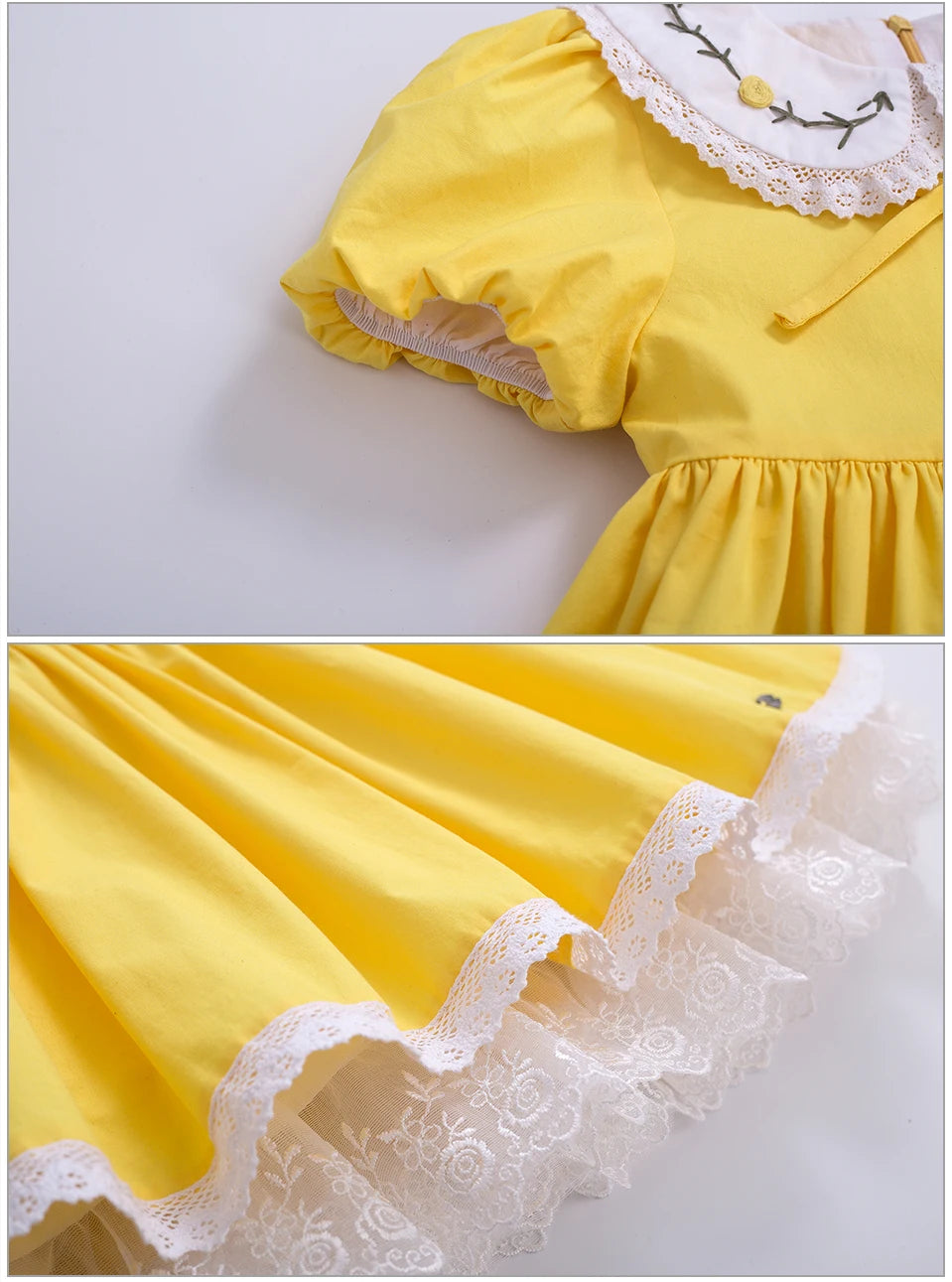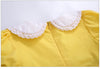 The "Yvette" Dress is a charming choice for your little girl’s special occasions. Its fresh yellow fabric is beautifully complemented by a delicate white lace trim that frames the hem, adding a touch of elegance. The full silhouette gently flows from a gathered waistline, enhanced by puffed short sleeves and a large bow at the back for a graceful finish. A matching headband will ensure her hair looks sweet and neat. A white Peter Pan collar, delicately embroidered, completes this timeless and delightful dress that will make her stand out with classic style.