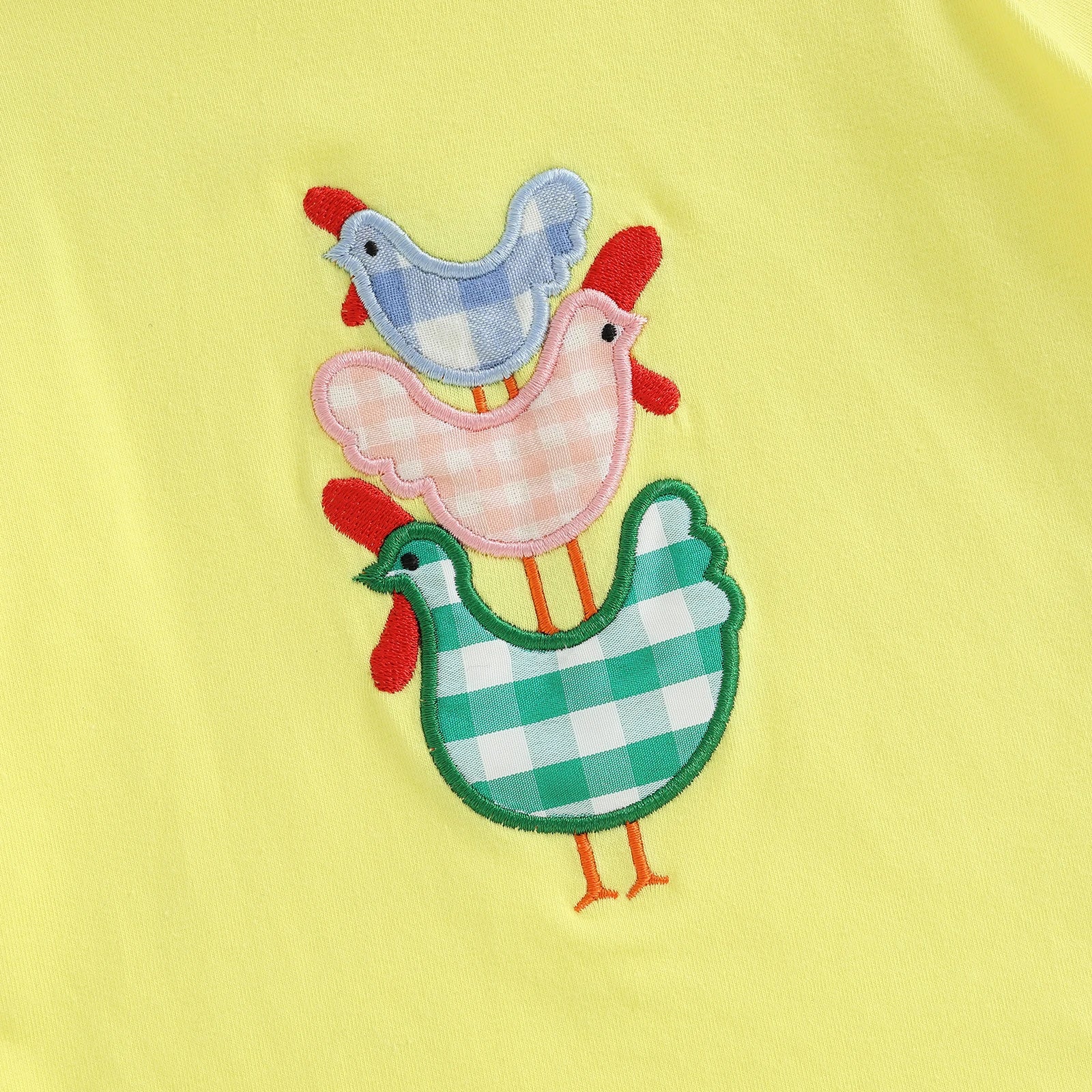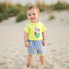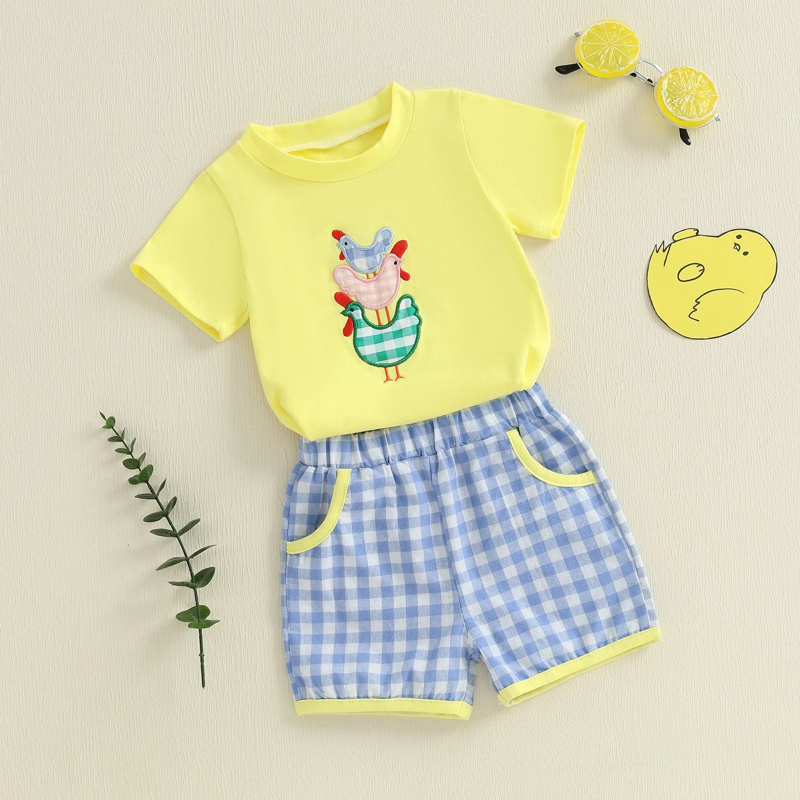 Dress your little boy in the charming "3 Little Chicks" Set, perfect for sunny days out. This adorable outfit features powder blue and white gingham elasticated shorts with a lemon yellow trim for a fun contrast. The lemon yellow t-shirt showcases three cute chick appliques standing atop each other, adding playful charm. Lightweight and comfortable, this set keeps your child cool and stylish for all his adventures.