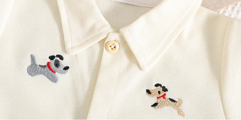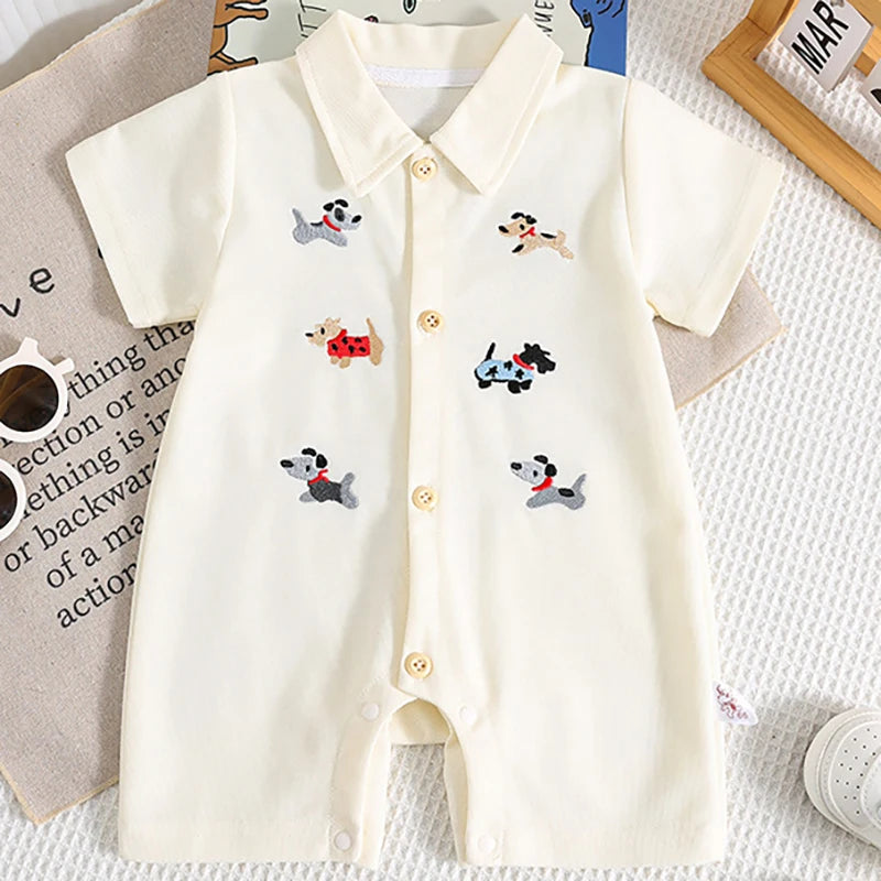 Dress your little one in the charming "Douglas" Romper, crafted from soft pique fabric for comfortable wear. This adorable polo-style romper features six delightful embroidered dogs, adding playful detail to a classic design. Perfect for everyday adventures, it combines style and ease to keep your boy looking cute and feeling free.