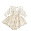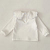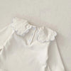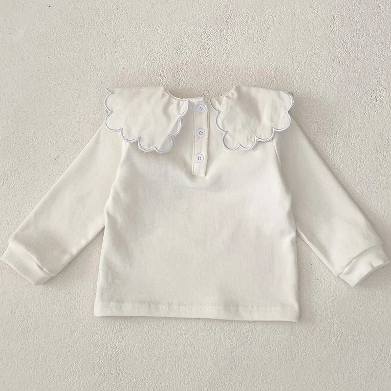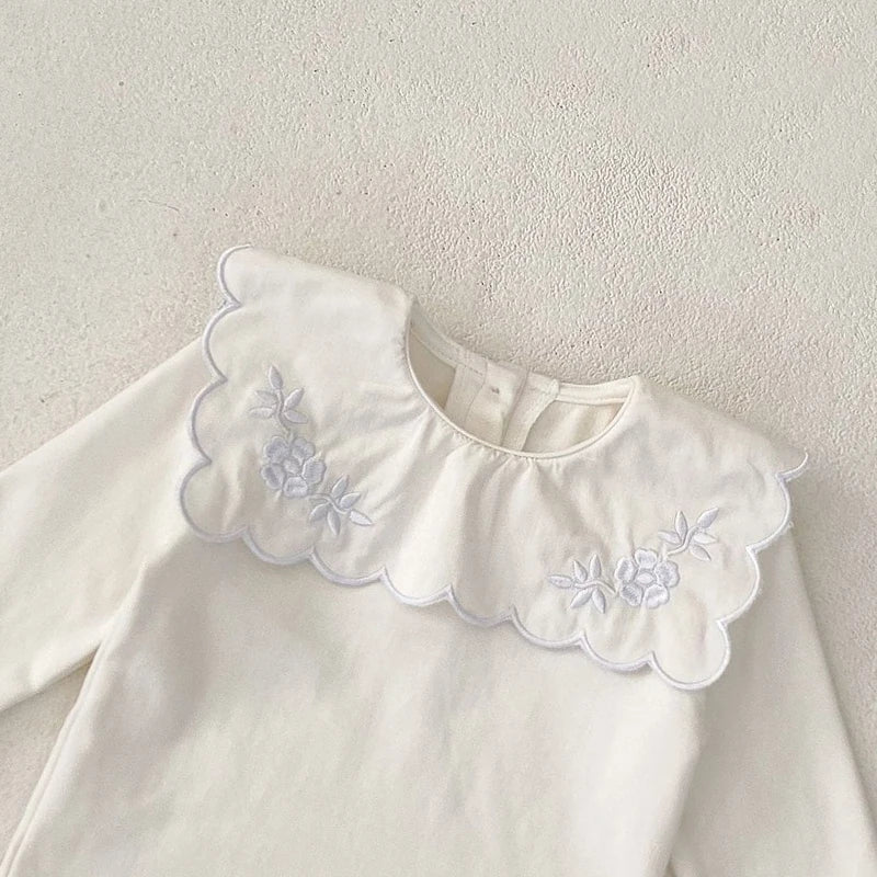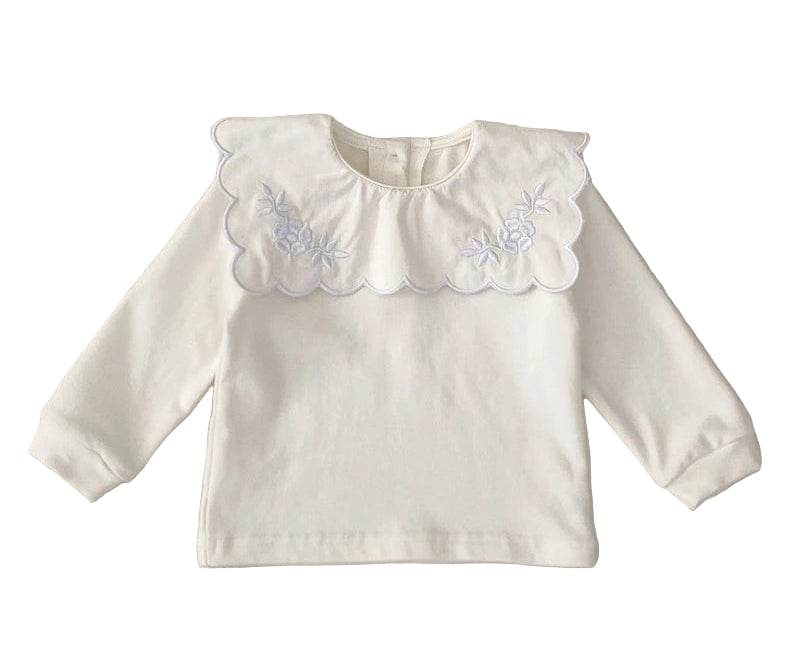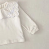 The "Harlow" Top is a charming essential for your little one's wardrobe. Crafted from soft white cotton knit, this long sleeved tee features an eye catching oversized collar adorned with delicate scalloped edges and an embroidered flower detail that adds instant personality.