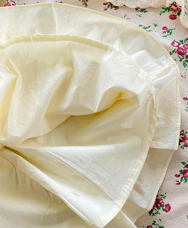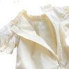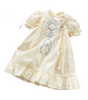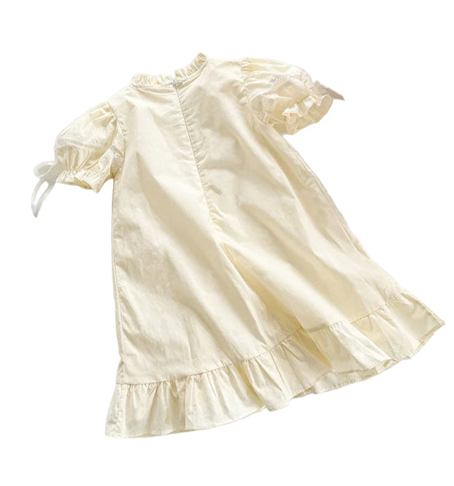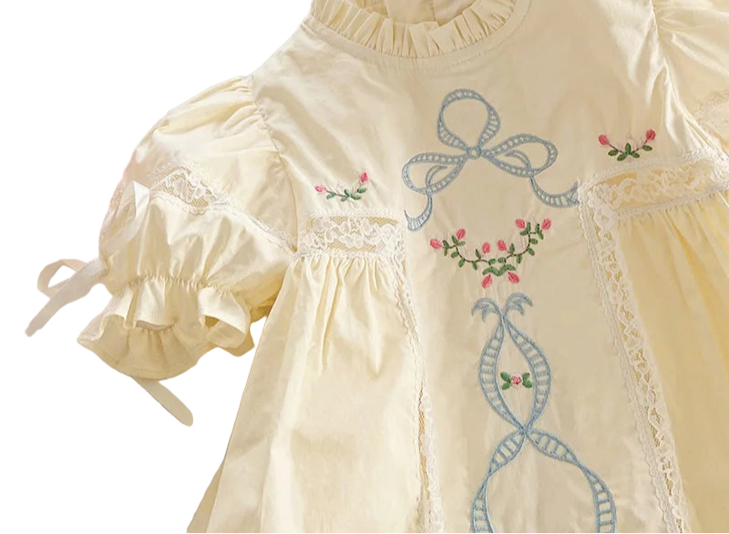 The "Louella" Dress embodies timeless elegance. Designed in off white cotton blend, delicately embroidered with soft pastel floral buds and flowing blue ribbons. Featuring subtle lace inserts and short puff sleeves finished with ribbon ties. The "Louella" lined dress offers a flowing silhouette. A ruffle frill gently accents the hem, completing its vintage charm.