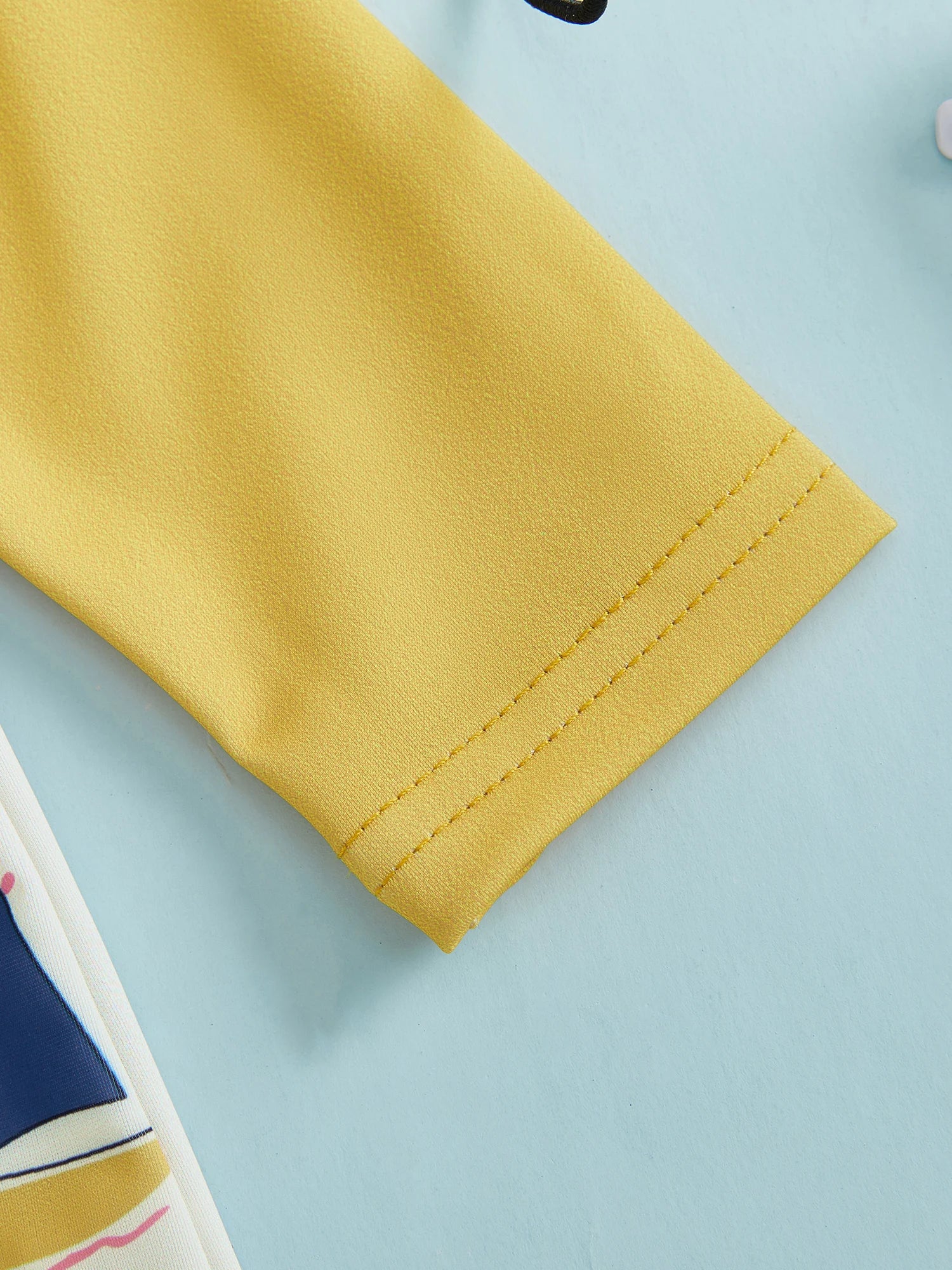 This adorable long sleeved, toddler's swim onesie is perfect for sunny adventures! Made with stretchy, spandex blend fabric ensures comfort, it features a convenient half zip front for easy changing. Complete with a matching swim friendly sun hat, this set offers great sun protection and keeps them covered during playtime in and out of the water.