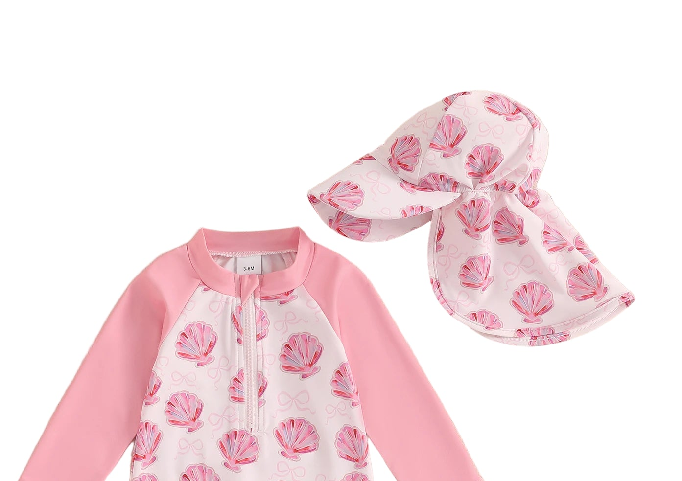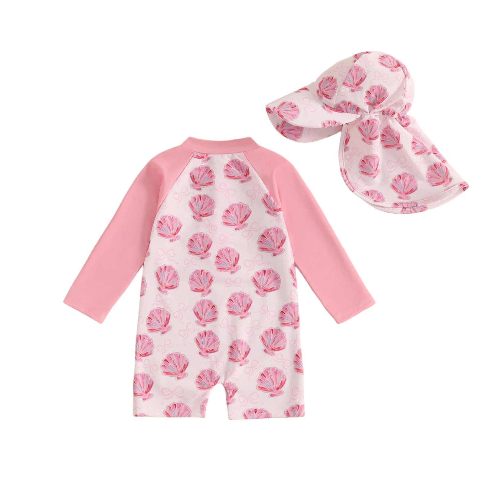 The adorable "Sea Shell" long sleeved, toddler's swim onesie is perfect for sunny adventures! Made with stretchy, spandex blend fabric and adorned with the prettiest of pink sea shells. It ensures comfort and features a convenient half zip front for easy changing. Complete with a matching swim friendly sun hat, this set offers great sun protection and keeps them covered during playtime in and out of the water.
