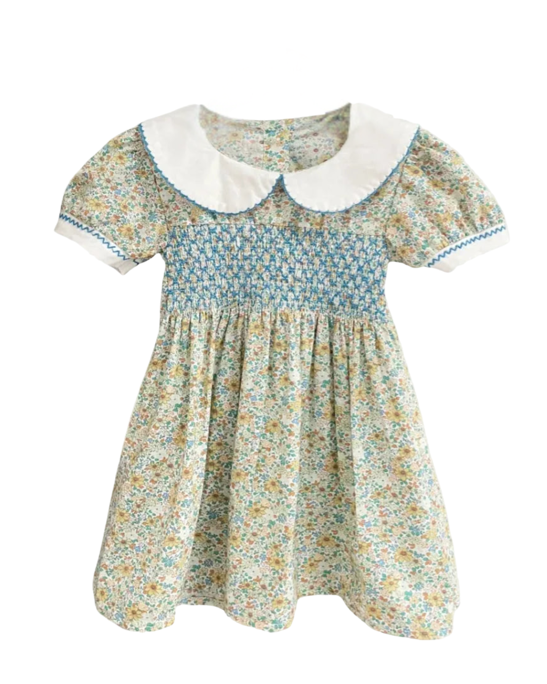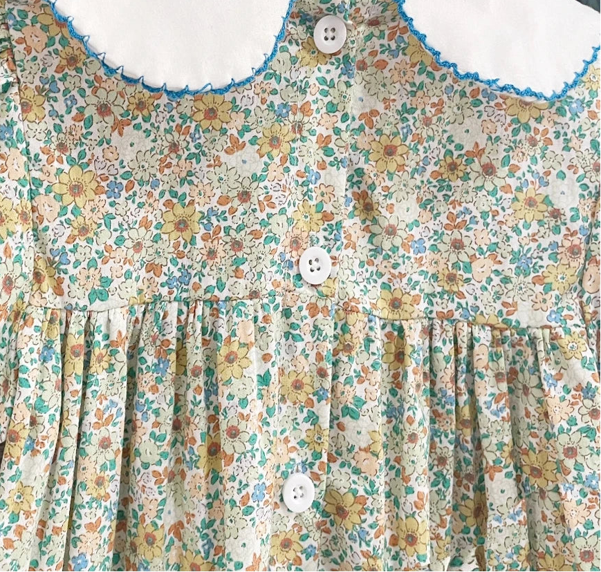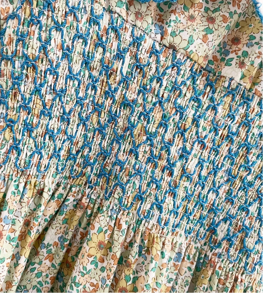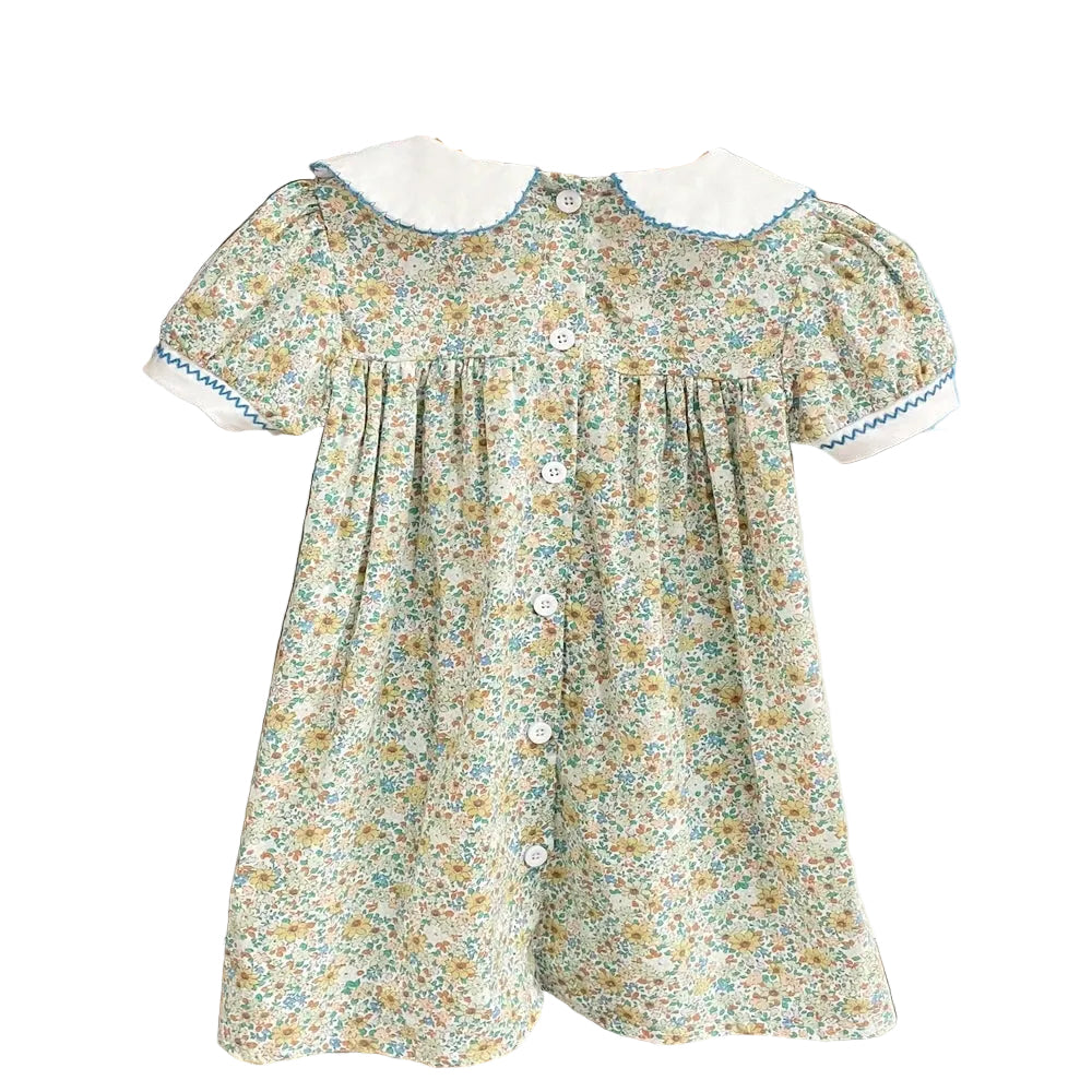 Introduce your little one to timeless elegance with the "Graciella" Dress, a must-have piece that combines vintage charm with modern comfort. This sweet, smocked, floral design features a white Peter Pan collar and delicate puffed sleeves, both beautifully accented with blue embroidery. The pretty, blue smocking creates a graceful silhouette that little girls adore, while the cheerful, floral print adds personality to any occasion. Whether for celebrations or everyday adventures, this dress is destined to become a cherished favourite.