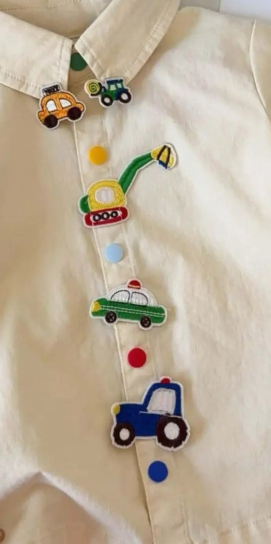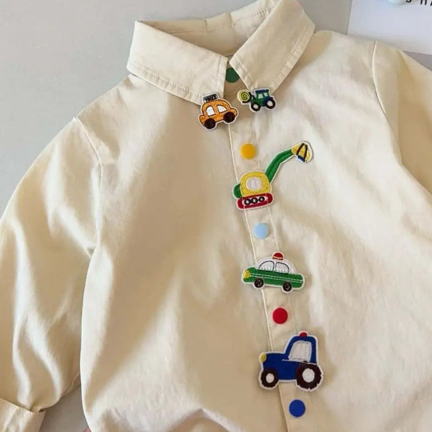 La camisa "Patrick": la combinación perfecta de estilo y alegría para los más pequeños. Disponible en un encantador denim azul o crema suave, esta encantadora camisa luce vibrantes vehículos con apliques que desfilan por la parte delantera. El cierre de botones a presión multicolor facilita el vestir a los padres ocupados, mientras que el detalle del canesú en la espalda luce vehículos a juego para un diseño cohesivo. Resistente y de confección meticulosa, esta camisa se convertirá en una prenda favorita al instante, combinando comodidad y personalidad. Ideal para el día a día o para ocasiones especiales, la camisa "Patrick" aporta alegría y personalidad a la colección de tu hijo.