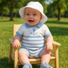La tutina "Levi", la scelta perfetta per il tuo piccolo marinaio! Realizzata in morbida maglia di cotone, questa tutina presenta un classico design a righe bianche e blu pastello con un adorabile dettaglio di ancora sul davanti. La chiusura con bottoni facilita il cambio del pannolino.