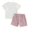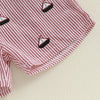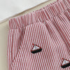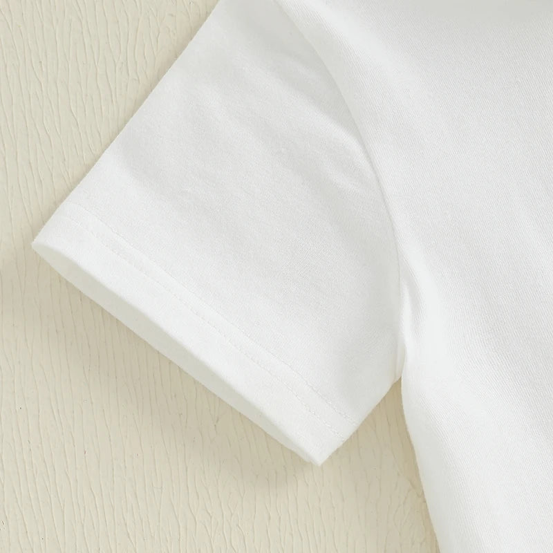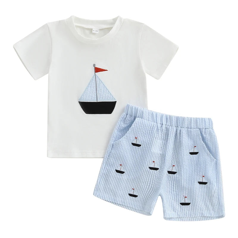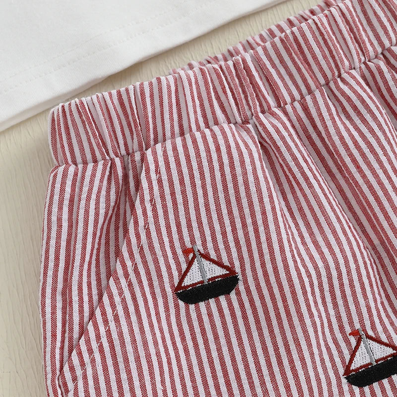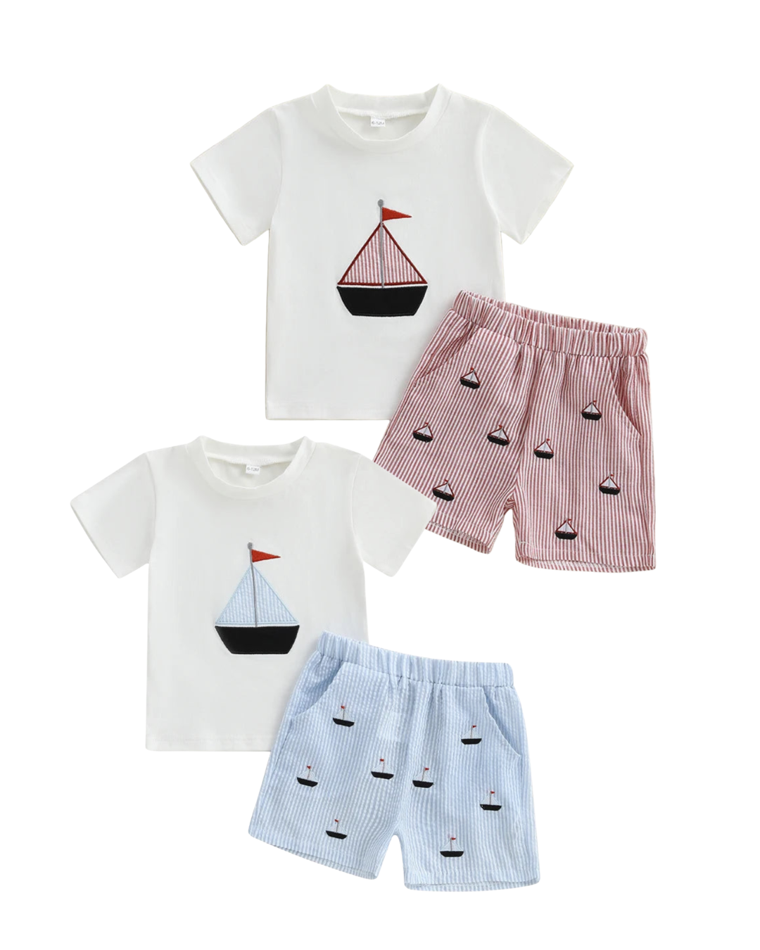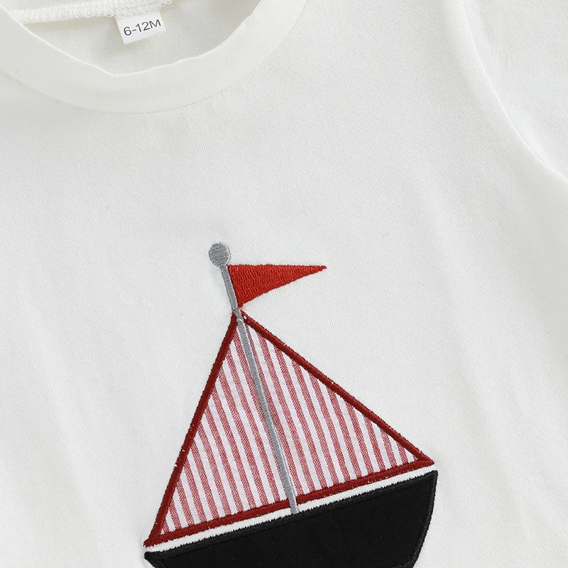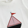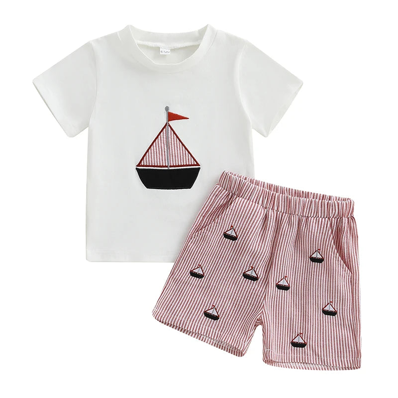 L'adorabile completo "Stephano" per bambini, composto da pantaloncini e maglietta, è perfetto per le avventure estive ed è disponibile nei colori blu o rosso. La morbida maglietta bianca presenta un'adorabile applicazione a forma di barca a vela, che aggiunge un tocco nautico giocoso. Abbinabile a pantaloncini in seersucker a righe blu e bianche o rosse e bianche, anch'essi ricamati con lo stesso motivo.